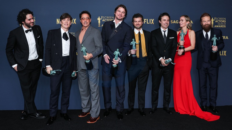 LOS ANGELES, CALIFORNIA, USA - FEBRUARY 24: Benny Safdie, Cillian Murphy, Robert Downey Jr., Josh Hartnett, Alden Ehrenreich, Casey Affleck, Emily Blunt and Kenneth Branagh, winners of the Outstanding Performance by a Cast in a Motion Picture award for 'Oppenheimer' pose in the press room at the 30th Annual Screen Actors Guild Awards held at the Shrine Auditorium and Expo Hall on February 24, 2024 in Los Angeles, California, United States., Credit:Xavier Collin / Avalon