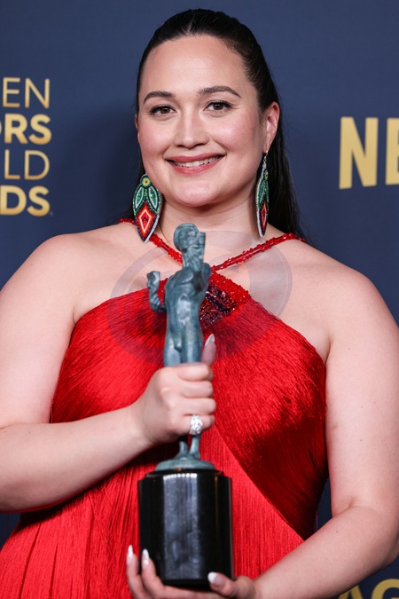 LOS ANGELES, CALIFORNIA, USA - FEBRUARY 24: Lily Gladstone, winner of the Outstanding Performance by a Female Actor in a Leading Role award for 'Killers of the Flower Moon' poses in the press room at the 30th Annual Screen Actors Guild Awards held at the Shrine Auditorium and Expo Hall on February 24, 2024 in Los Angeles, California, United States., Credit:Xavier Collin / Avalon