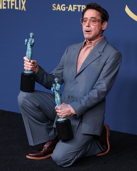 LOS ANGELES, CALIFORNIA, USA - FEBRUARY 24: Robert Downey Jr., winner of the Outstanding Performance by a Male Actor in a Supporting Role award and the Outstanding Performance by a Cast in a Motion Picture award for 'Oppenheimer' poses in the press room at the 30th Annual Screen Actors Guild Awards held at the Shrine Auditorium and Expo Hall on February 24, 2024 in Los Angeles, California, United States., Credit:Xavier Collin / Avalon