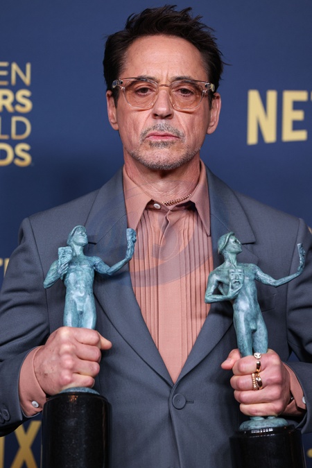 LOS ANGELES, CALIFORNIA, USA - FEBRUARY 24: Robert Downey Jr., winner of the Outstanding Performance by a Male Actor in a Supporting Role award and the Outstanding Performance by a Cast in a Motion Picture award for 'Oppenheimer' poses in the press room at the 30th Annual Screen Actors Guild Awards held at the Shrine Auditorium and Expo Hall on February 24, 2024 in Los Angeles, California, United States., Credit:Xavier Collin / Avalon