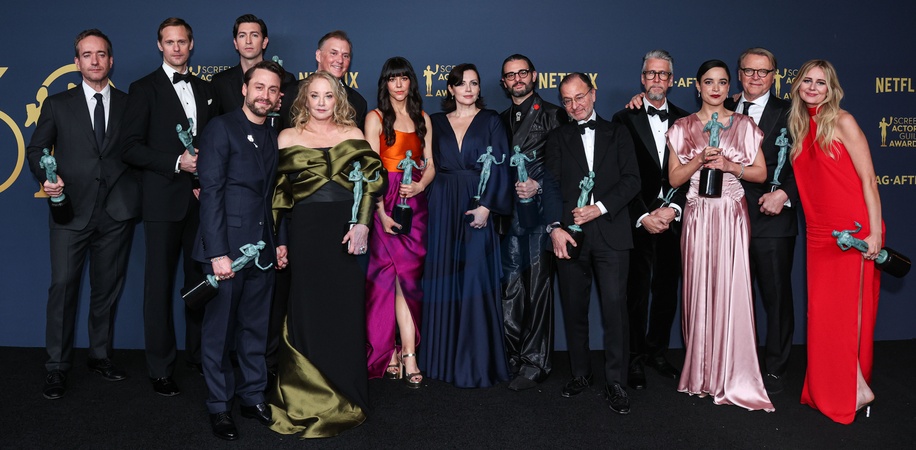 LOS ANGELES, CALIFORNIA, USA - FEBRUARY 24: Matthew Macfadyen, Kieran Culkin, J. Smith-Cameron, Scott Nicholson, Alexander Skarsgård, Dagmara Dominczyk, Zoe Winters, Fisher Stevens, Nicholas Braun, Arian Moayed, Alan Ruck, Juliana Canfield, David Rasche, Justine Lupe pose in the press room at the 30th Annual Screen Actors Guild Awards held at the Shrine Auditorium and Expo Hall on February 24, 2024 in Los Angeles, California, United States., Credit:Xavier Collin / Avalon