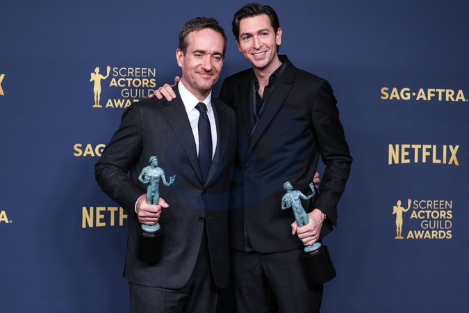 LOS ANGELES, CALIFORNIA, USA - FEBRUARY 24: Matthew Macfadyen and Nicholas Braun, winners of the Outstanding Performance by an Ensemble in a Drama Series award for 'Succession' pose in the press room at the 30th Annual Screen Actors Guild Awards held at the Shrine Auditorium and Expo Hall on February 24, 2024 in Los Angeles, California, United States., Credit:Xavier Collin / Avalon