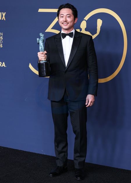LOS ANGELES, CALIFORNIA, USA - FEBRUARY 24: Steven Yeun, winner of the Outstanding Male Actor in a Television Movie or Limited Series award for 'Beef' poses in the press room at the 30th Annual Screen Actors Guild Awards held at the Shrine Auditorium and Expo Hall on February 24, 2024 in Los Angeles, California, United States., Credit:Xavier Collin / Avalon