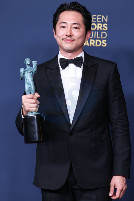 LOS ANGELES, CALIFORNIA, USA - FEBRUARY 24: Steven Yeun, winner of the Outstanding Male Actor in a Television Movie or Limited Series award for 'Beef' poses in the press room at the 30th Annual Screen Actors Guild Awards held at the Shrine Auditorium and Expo Hall on February 24, 2024 in Los Angeles, California, United States., Credit:Xavier Collin / Avalon