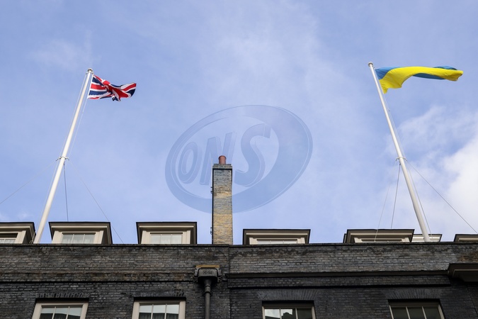 23/02/2024. London, United Kingdom. The Ukrainian flag flies over Downing Street two years on from the Russian invasion of Ukraine, Credit:Rory Arnold / Avalon
