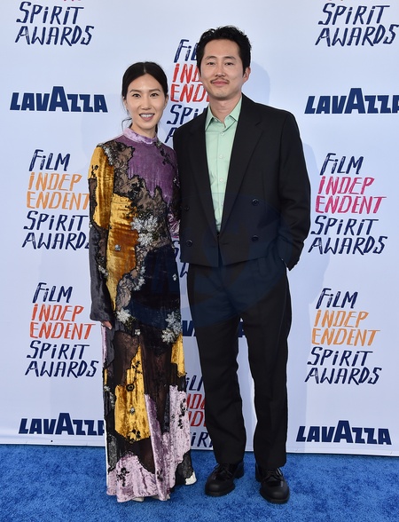Joana Pak and Steven Yeun arriving to the 2024 Film Independent Spirit Awards at the Santa Monica Beach on February 25, 2024 in Santa Monica