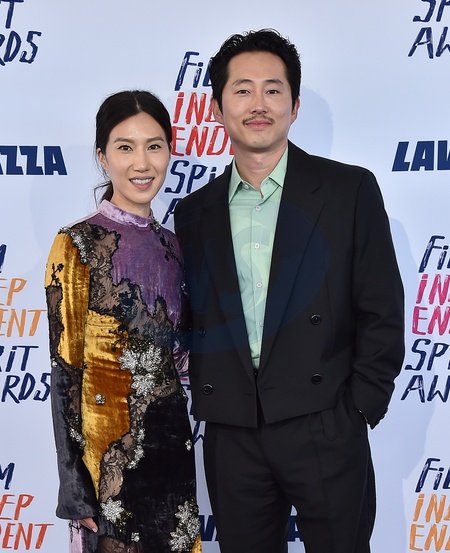 Joana Pak and Steven Yeun arriving to the 2024 Film Independent Spirit Awards at the Santa Monica Beach on February 25, 2024 in Santa Monica