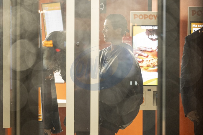 Exclusif - Bianca Censori et North West vont au restaurant Popeyes après le concert de Kanye à l'Accor Arena puis changent d'avis pour aller au Mc Donald le 25 février 2024. Exclusive - For Germany call for price - No web en Suisse / Belgique Bianca Censori and North West go to Popeyes after Kanye's concert at the Accor Arena, then change their minds and go to McDonald's on 25 February 2024.