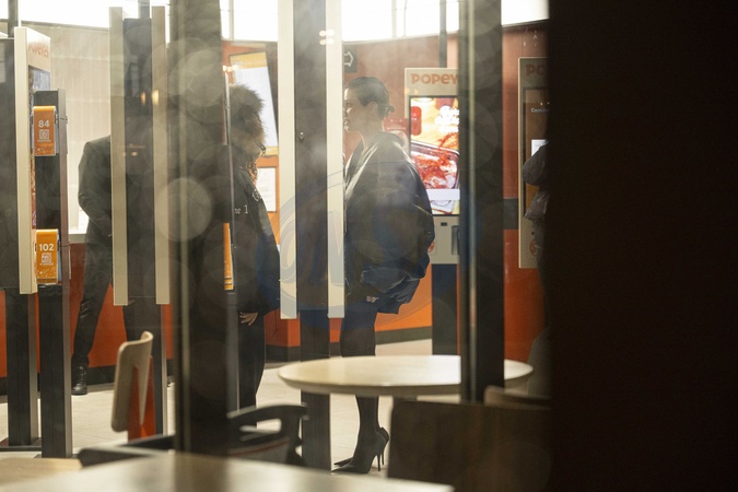 Exclusif - Bianca Censori et North West vont au restaurant Popeyes après le concert de Kanye à l'Accor Arena puis changent d'avis pour aller au Mc Donald le 25 février 2024. Exclusive - For Germany call for price - No web en Suisse / Belgique Bianca Censori and North West go to Popeyes after Kanye's concert at the Accor Arena, then change their minds and go to McDonald's on 25 February 2024.