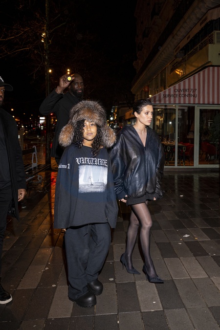 Exclusif - Bianca Censori et North West vont au restaurant Popeyes après le concert de Kanye à l'Accor Arena puis changent d'avis pour aller au Mc Donald le 25 février 2024. Exclusive - For Germany call for price - No web en Suisse / Belgique Bianca Censori and North West go to Popeyes after Kanye's concert at the Accor Arena, then change their minds and go to McDonald's on 25 February 2024.