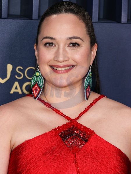 LOS ANGELES, CALIFORNIA, USA - FEBRUARY 24: Lily Gladstone wearing a Louis Vuitton metallic lace slip gown, embroidered with sequins, pearls and crystals fern leaf pattern and ivory sandals with Louis Vuitton High Jewelry arrives at the 30th Annual Screen Actors Guild Awards held at the Shrine Auditorium and Expo Hall on February 24, 2024 in Los Angeles, California, United States., Credit:Xavier Collin / Avalon