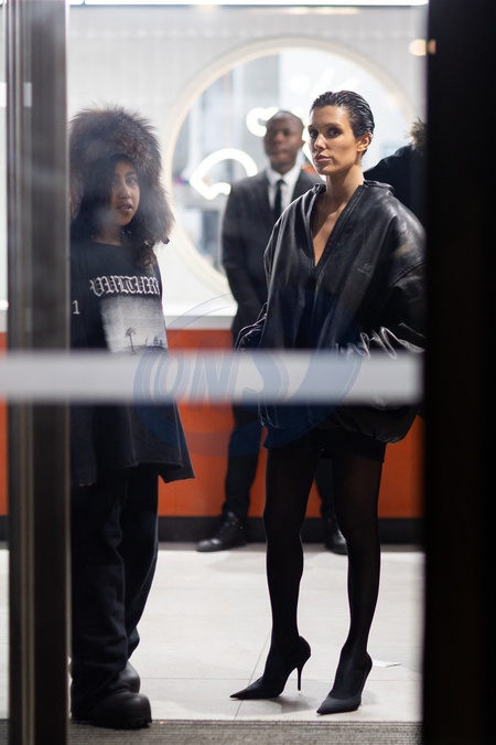 Exclusif - Bianca Censori et North West vont au restaurant Popeyes après le concert de Kanye à l'Accor Arena puis changent d'avis pour aller au Mc Donald le 25 février 2024 Exclusive - For Germany call for price - No web en Suisse / Belgique Bianca Censori and North West go to Popeyes after Kanye's concert at the Accor Arena then change their minds and go to McDonald's on 25 February 2024
