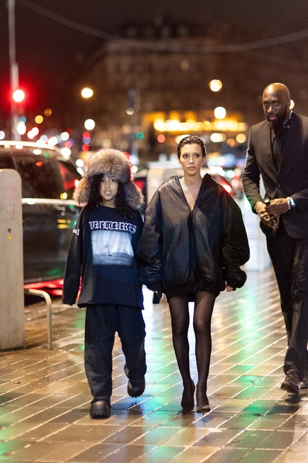 Exclusif - Bianca Censori et North West vont au restaurant Popeyes après le concert de Kanye à l'Accor Arena puis changent d'avis pour aller au Mc Donald le 25 février 2024 Exclusive - For Germany call for price - No web en Suisse / Belgique Bianca Censori and North West go to Popeyes after Kanye's concert at the Accor Arena then change their minds and go to McDonald's on 25 February 2024