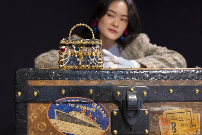 Bonhams, Knightsbridge, London, UK. 26th Feb, 2024. Bonhams Knightsbridge hosts the first Designer Handbags and Fashion sale of 2024. The live sale on 28 February features luxurious items of handbags and ready-to-wear designs from coveted names including Chanel, Hermès, Karl Lagerfeld for Chanel, Christian Dior, Louis Vuitton, and Gucci. Highlights include: Louis Vuitton: Woven Monogram Canvas Hatbox Trunk, early 1920's, estimate £3,000-5,000. Decorated with stickers including Cunard White Star Queen Mary to Europe sailing from New York. On top, Judith Leiber: a Gold 'Sunken Treasure Chest' Clutch Bag, 2022, estimate £600-800., Credit:MALCOLM PARK / Avalon