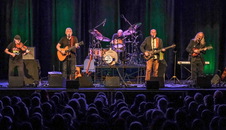 Fairport Convention.Corn Exchange.Exeter UK.25 February2024: Simon Nicol, Dave Pegg, Chris Leslie, Ric Sanders and Dave Mattacks, Fairport Convention, during their Win Tour 2024 perform in front of a capacity audience Corn Exchange Exeter., Credit:Charlie Bryan / Avalon