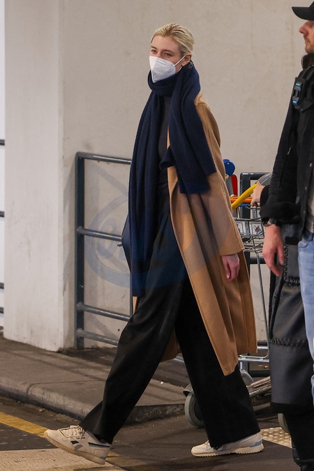 Exclusif - Elizabeth Debicki arrive à l'aéroport Roissy CDG la veille de la semaine de la mode femme automne/hiver 2024-2025 (Paris Fashion Week) le 26 février 2024. Elizabeth Debicki a reçu le prix de la Meilleure actrice dans une série dramatique (The Crown) à l'occasion de la cérémonie des SAG Awards le 24 février 2024 Exclusive - No web en Suisse / Belgique Elizabeth Debicki arrives at Roissy CDG airport on the eve of Paris Fashion Week 2024-2025 on 26 February 2024. Elizabeth Debicki received the award for Best Actress in a Drama Series (The Crown) at the SAG Awards ceremony on 24 February 2024.