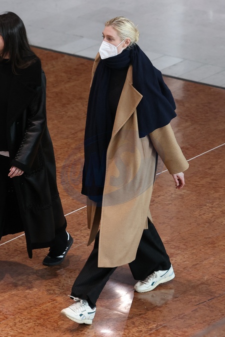 Exclusif - Elizabeth Debicki arrive à l'aéroport Roissy CDG la veille de la semaine de la mode femme automne/hiver 2024-2025 (Paris Fashion Week) le 26 février 2024. Elizabeth Debicki a reçu le prix de la Meilleure actrice dans une série dramatique (The Crown) à l'occasion de la cérémonie des SAG Awards le 24 février 2024 Exclusive - No web en Suisse / Belgique Elizabeth Debicki arrives at Roissy CDG airport on the eve of Paris Fashion Week 2024-2025 on 26 February 2024. Elizabeth Debicki received the award for Best Actress in a Drama Series (The Crown) at the SAG Awards ceremony on 24 February 2024.
