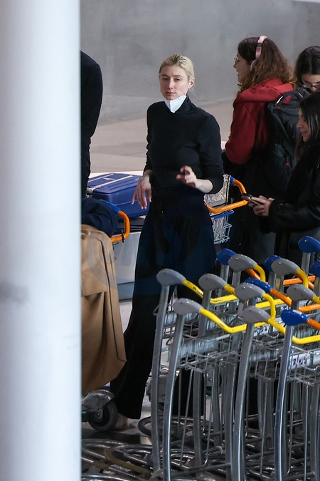 Exclusif - Elizabeth Debicki arrive à l'aéroport Roissy CDG la veille de la semaine de la mode femme automne/hiver 2024-2025 (Paris Fashion Week) le 26 février 2024. Elizabeth Debicki a reçu le prix de la Meilleure actrice dans une série dramatique (The Crown) à l'occasion de la cérémonie des SAG Awards le 24 février 2024 Exclusive - No web en Suisse / Belgique Elizabeth Debicki arrives at Roissy CDG airport on the eve of Paris Fashion Week 2024-2025 on 26 February 2024. Elizabeth Debicki received the award for Best Actress in a Drama Series (The Crown) at the SAG Awards ceremony on 24 February 2024.