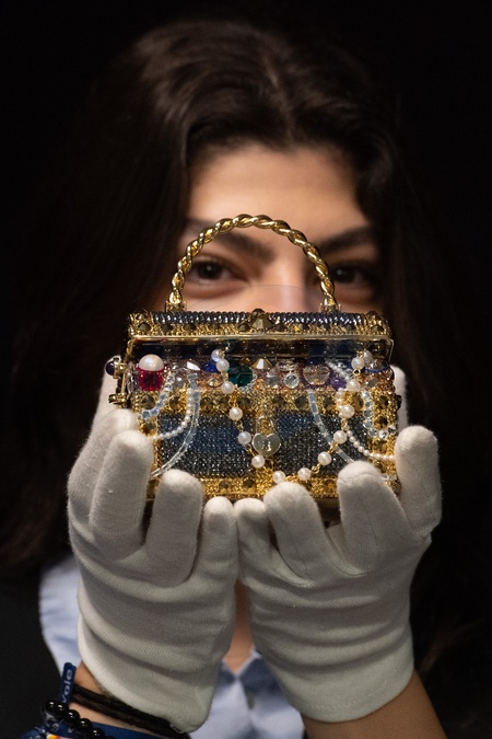 A staff member holds a Gold 'Sunken Treasure Chest' Clutch Bag by Judith Leiber (est. £600-£800) which is part of Bonhams' Designer Handbags and Fashion Sale on 28th February 2024 - Bonhams Knightsbridge, London, England, UK on Monday 26 February, 2024., Credit:Justin Ng / Avalon