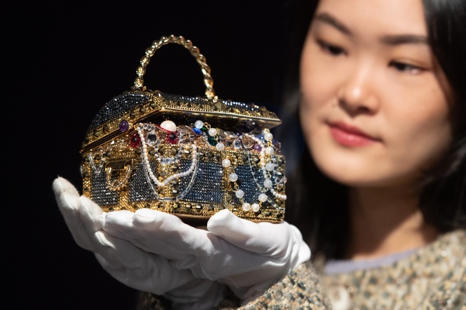 A staff member holds a Gold 'Sunken Treasure Chest' Clutch Bag by Judith Leiber (est. £600-£800) which is part of Bonhams' Designer Handbags and Fashion Sale on 28th February 2024 - Bonhams Knightsbridge, London, England, UK on Monday 26 February, 2024., Credit:Justin Ng / Avalon