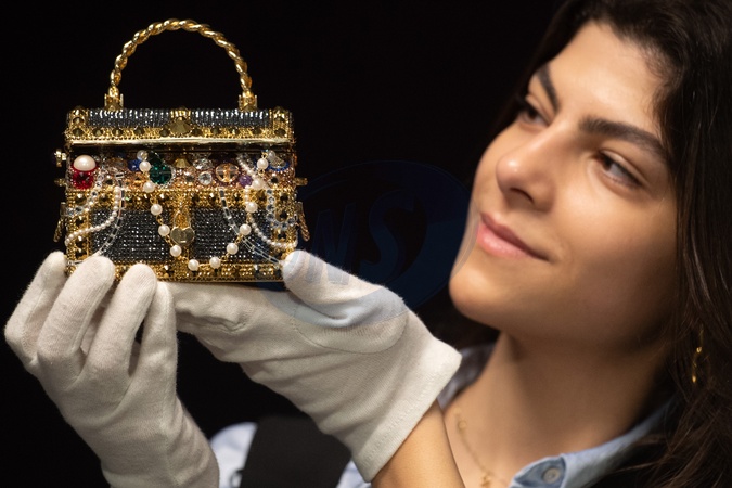 A staff member holds a Gold 'Sunken Treasure Chest' Clutch Bag by Judith Leiber (est. £600-£800) which is part of Bonhams' Designer Handbags and Fashion Sale on 28th February 2024 - Bonhams Knightsbridge, London, England, UK on Monday 26 February, 2024., Credit:Justin Ng / Avalon