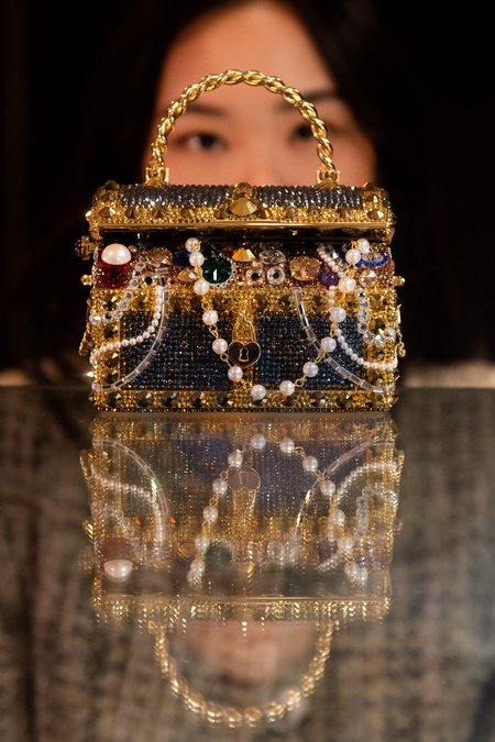 A staff member holds a Gold 'Sunken Treasure Chest' Clutch Bag by Judith Leiber (est. £600-£800) which is part of Bonhams' Designer Handbags and Fashion Sale on 28th February 2024 - Bonhams Knightsbridge, London, England, UK on Monday 26 February, 2024., Credit:Justin Ng / Avalon