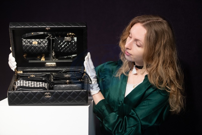 A staff member holds a Success Story Set of Four Classic Black Micro Mini Bags (est. £15,000 - £20,000) by Virginie Viard for Chanel which is part of Bonhams' Designer Handbags and Fashion Sale on 28th February 2024 - Bonhams Knightsbridge, London, England, UK on Monday 26 February, 2024., Credit:Justin Ng / Avalon