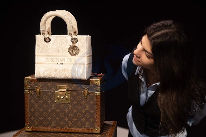 A staff member views a Light Gold and Cream Embroidered Canvas Medium Lady D-Lite Bag by Christian Dior (est. £2,500 - £3,000) which is part of Bonhams' Designer Handbags and Fashion Sale on 28th February 2024 - Bonhams Knightsbridge, London, England, UK on Monday 26 February, 2024., Credit:Justin Ng / Avalon