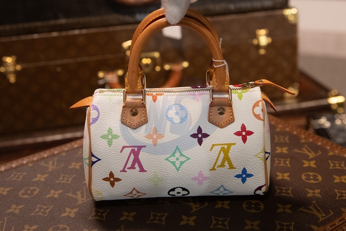 A staff member holds a White Multicolore Monogram Nano Speedy by Louis Vuitton x Takashi Murakami (est. £600 - £800) which is part of Bonhams' Designer Handbags and Fashion Sale on 28th February 2024 - Bonhams Knightsbridge, London, England, UK on Monday 26 February, 2024., Credit:Justin Ng / Avalon