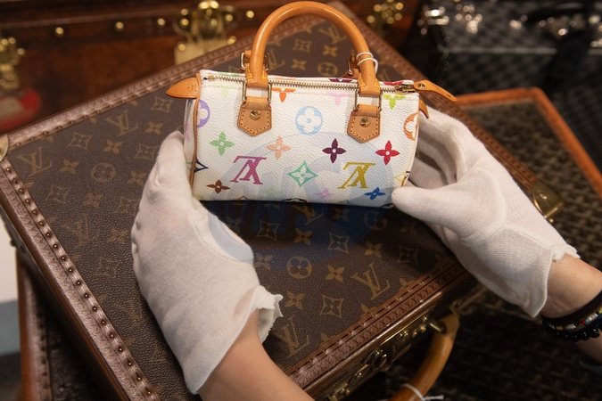 A staff member holds a White Multicolore Monogram Nano Speedy by Louis Vuitton x Takashi Murakami (est. £600 - £800) which is part of Bonhams' Designer Handbags and Fashion Sale on 28th February 2024 - Bonhams Knightsbridge, London, England, UK on Monday 26 February, 2024., Credit:Justin Ng / Avalon