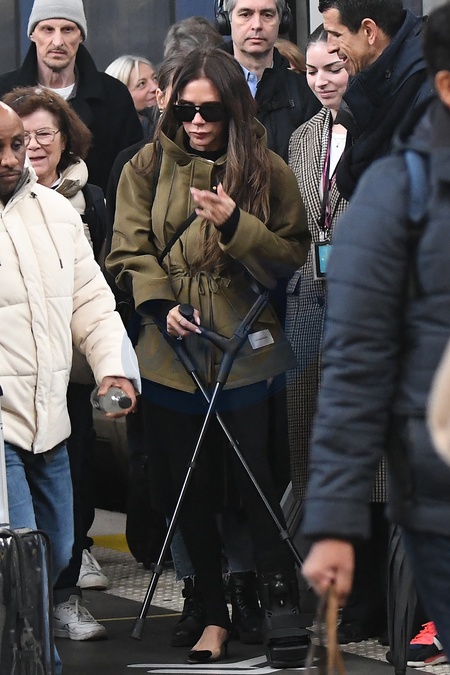 Semi-exclusif - Victoria Beckham arrive sous une pluie battante à Gare du Nord, marchant avec des béquilles et portant une botte de protection (attelle) à Paris, France, le 26 février 2024. La Spice Girl de 49 ans s'est cassé le pied le jour de la Saint-Valentin après être tombée à la salle de sport. Semi-Exclusive - Victoria Beckham arrives at Gare du Nord, walking on crutches and wearing a protective boot (splint) in Paris, France on February 26, 2024. The 49-year-old Spice Girl broke her foot on the day of on Valentine's Day after falling at the gym.