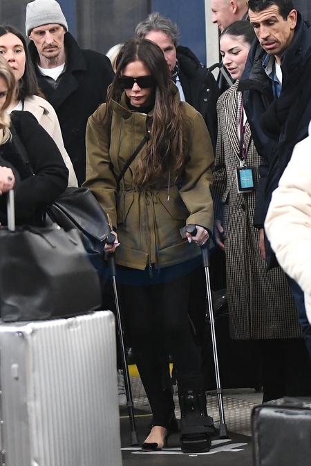 Semi-exclusif - Victoria Beckham arrive sous une pluie battante à Gare du Nord, marchant avec des béquilles et portant une botte de protection (attelle) à Paris, France, le 26 février 2024. La Spice Girl de 49 ans s'est cassé le pied le jour de la Saint-Valentin après être tombée à la salle de sport. Semi-Exclusive - Victoria Beckham arrives at Gare du Nord, walking on crutches and wearing a protective boot (splint) in Paris, France on February 26, 2024. The 49-year-old Spice Girl broke her foot on the day of on Valentine's Day after falling at the gym.