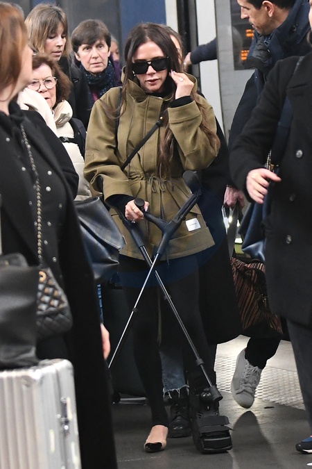 Semi-exclusif - Victoria Beckham arrive sous une pluie battante à Gare du Nord, marchant avec des béquilles et portant une botte de protection (attelle) à Paris, France, le 26 février 2024. La Spice Girl de 49 ans s'est cassé le pied le jour de la Saint-Valentin après être tombée à la salle de sport. Semi-Exclusive - Victoria Beckham arrives at Gare du Nord, walking on crutches and wearing a protective boot (splint) in Paris, France on February 26, 2024. The 49-year-old Spice Girl broke her foot on the day of on Valentine's Day after falling at the gym.