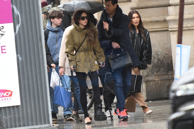 Semi-exclusif - Victoria Beckham arrive sous une pluie battante à Gare du Nord, marchant avec des béquilles et portant une botte de protection (attelle) à Paris, France, le 26 février 2024. La Spice Girl de 49 ans s'est cassé le pied le jour de la Saint-Valentin après être tombée à la salle de sport. Semi-Exclusive - Victoria Beckham arrives at Gare du Nord, walking on crutches and wearing a protective boot (splint) in Paris, France on February 26, 2024. The 49-year-old Spice Girl broke her foot on the day of on Valentine's Day after falling at the gym.