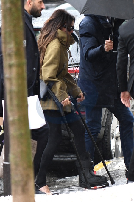 Semi-exclusif - Victoria Beckham arrive sous une pluie battante à Gare du Nord, marchant avec des béquilles et portant une botte de protection (attelle) à Paris, France, le 26 février 2024. La Spice Girl de 49 ans s'est cassé le pied le jour de la Saint-Valentin après être tombée à la salle de sport. Semi-Exclusive - Victoria Beckham arrives at Gare du Nord, walking on crutches and wearing a protective boot (splint) in Paris, France on February 26, 2024. The 49-year-old Spice Girl broke her foot on the day of on Valentine's Day after falling at the gym.