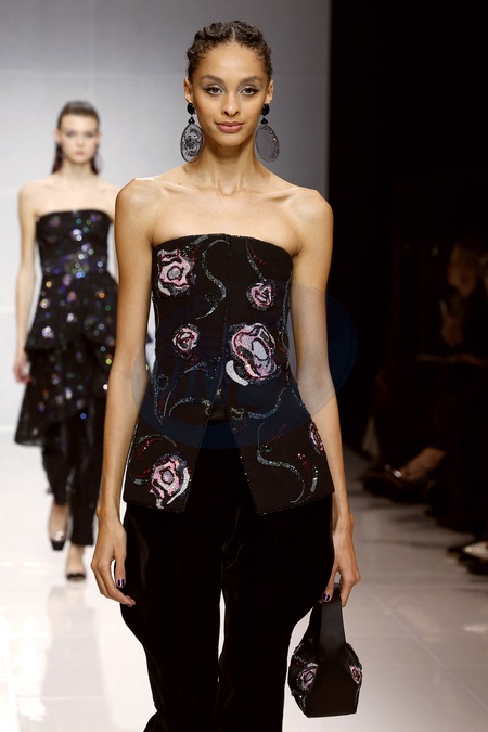 Défilé Giorgio Armani mode femme automne / hiver 2024-2025 lors de la Fashion Week de Milan (MFW), à Milan, Italie, le 25 février 2024. Giorgio Armani fashion show during the Milan Fashion Week Womenswear Fall/Winter 2024-2025 on February 25, 2024 in Milan, Italy.