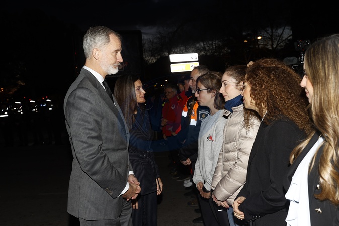 Le roi Felipe VI et la reine Letizia visitent la zone d'un complexe d'appartements de 14 étages après l'incendie qui l'a ravagé jeudi dernier à Valence le 26 février 2024. Pool King Felipe VI of Spain and Queen Letizia visit the area of a 14 floor apartment complex after fire tore through it last Thursday on February 26, 2024 in Valencia, Spain. The fire started on Thursday evening and killed 10 people. Pool