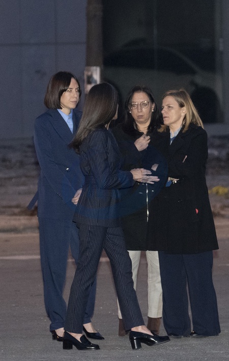 Le roi Felipe VI et la reine Letizia visitent la zone d'un complexe d'appartements de 14 étages après l'incendie qui l'a ravagé jeudi dernier à Valence le 26 février 2024. King Felipe VI of Spain and Queen Letizia visit the area of a 14 floor apartment complex after fire tore through it last Thursday on February 26, 2024 in Valencia, Spain. The fire started on Thursday evening and killed 10 people.