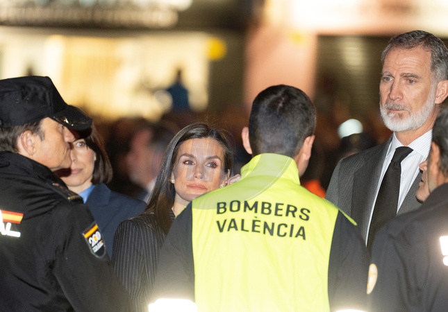 Le roi Felipe VI et la reine Letizia visitent la zone d'un complexe d'appartements de 14 étages après l'incendie qui l'a ravagé jeudi dernier à Valence le 26 février 2024. King Felipe VI of Spain and Queen Letizia visit the area of a 14 floor apartment complex after fire tore through it last Thursday on February 26, 2024 in Valencia, Spain. The fire started on Thursday evening and killed 10 people.