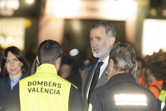 Le roi Felipe VI et la reine Letizia visitent la zone d'un complexe d'appartements de 14 étages après l'incendie qui l'a ravagé jeudi dernier à Valence le 26 février 2024. King Felipe VI of Spain and Queen Letizia visit the area of a 14 floor apartment complex after fire tore through it last Thursday on February 26, 2024 in Valencia, Spain. The fire started on Thursday evening and killed 10 people.