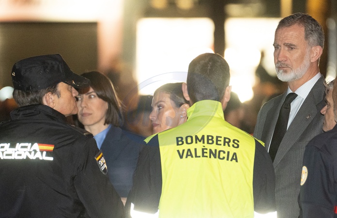 Le roi Felipe VI et la reine Letizia visitent la zone d'un complexe d'appartements de 14 étages après l'incendie qui l'a ravagé jeudi dernier à Valence le 26 février 2024. King Felipe VI of Spain and Queen Letizia visit the area of a 14 floor apartment complex after fire tore through it last Thursday on February 26, 2024 in Valencia, Spain. The fire started on Thursday evening and killed 10 people.