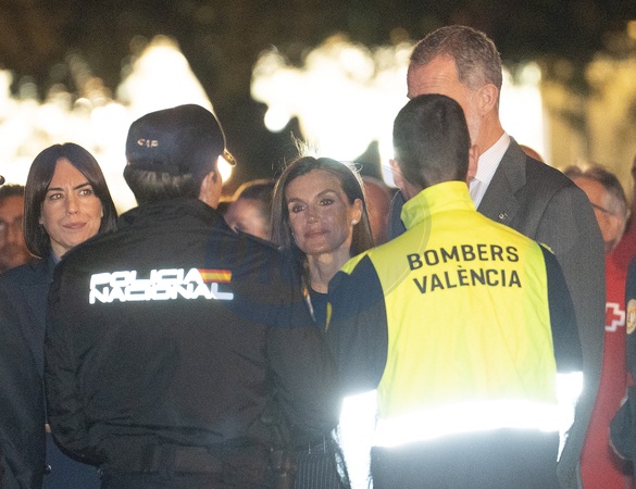 Le roi Felipe VI et la reine Letizia visitent la zone d'un complexe d'appartements de 14 étages après l'incendie qui l'a ravagé jeudi dernier à Valence le 26 février 2024. King Felipe VI of Spain and Queen Letizia visit the area of a 14 floor apartment complex after fire tore through it last Thursday on February 26, 2024 in Valencia, Spain. The fire started on Thursday evening and killed 10 people.