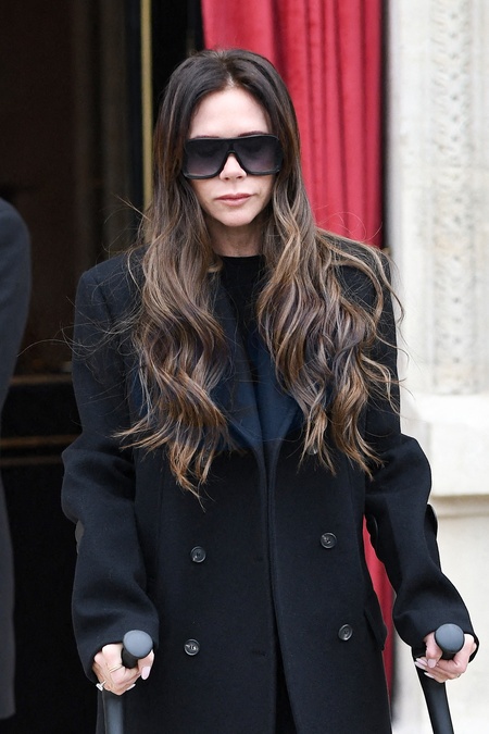 Victoria Beckham, kontuzjowana lewą stopę, opuszcza restaurację La Réserve o kulach na marginesie tygodnia mody damskiej jesień/zima 2024-2025 w Paryżu