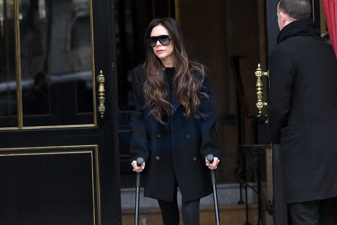 Victoria Beckham, blessée au pied gauche, sort du restaurant La réserve avec ses béquilles en marge de la fashion week femme automne/hiver 2024-2025 à Paris (PFW) le 27 février 2024. La Spice Girl de 49 ans s'est cassée le pied le jour de la Saint-Valentin après être tombée à la salle de sport. Victoria Beckham, who injured her left foot, leaves the restaurant La Réserve with her crutches on the sidelines of the women's fashion week autumn/winter 2024-2025 in Paris (PFW) on February 27, 2024. The 49-year-old Spice Girl broke her foot on Valentine's Day after falling at the gym.
