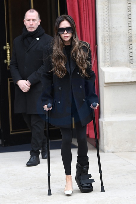 Victoria Beckham, blessée au pied gauche, sort du restaurant La réserve avec ses béquilles en marge de la fashion week femme automne/hiver 2024-2025 à Paris (PFW)