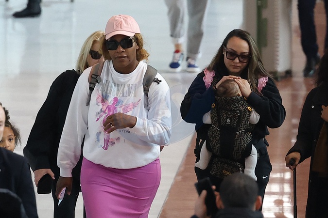 Exclusif - Serena William avec ses filles Olympia et Adira arrivent à l'aéroport de Paris-Charles de Gaulle (CDG) lors de la semaine de la mode femme automne/hiver 2024-2025 (PFW), à Roissy-en-France, France, le 27 février 2024. Merci de flouter le visage des enfants avant publication Exclusive - For Germany Call For Price -Serena William and her daughters Olympia and Adira arrive at Paris-Charles de Gaulle Airport (CDG) during Women's Fashion Week Fall/Winter 2024-2025 (PFW), in Roissy-en-France, France, on February 27, 2024.