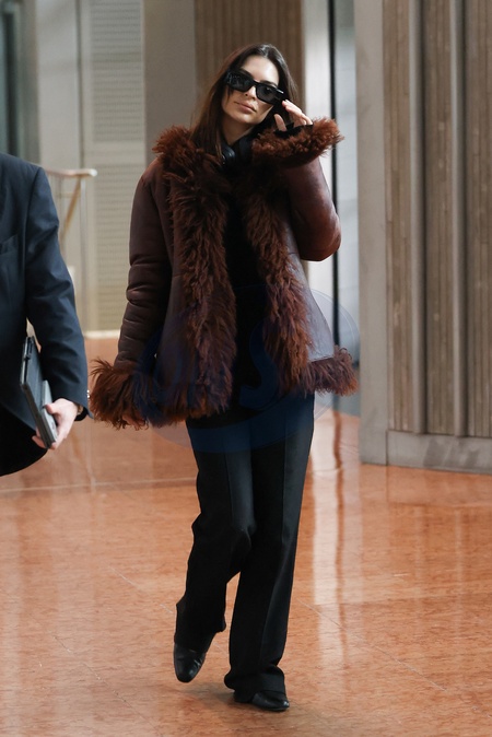 Exclusif - Emily Ratajkowski arrive à l'aéroport de Paris-Charles de Gaulle (CDG) lors de la semaine de la mode femme automne/hiver 2024-2025 (PFW), à Roissy-en-France, France, le 27 février 2024. Exclusive - For Germany Call For Price - Emily Ratajkowski arrives at Paris-Charles de Gaulle Airport (CDG) during Women's Fashion Week Fall/Winter 2024-2025 (PFW), in Roissy-en-France, France, on February 27, 2024.