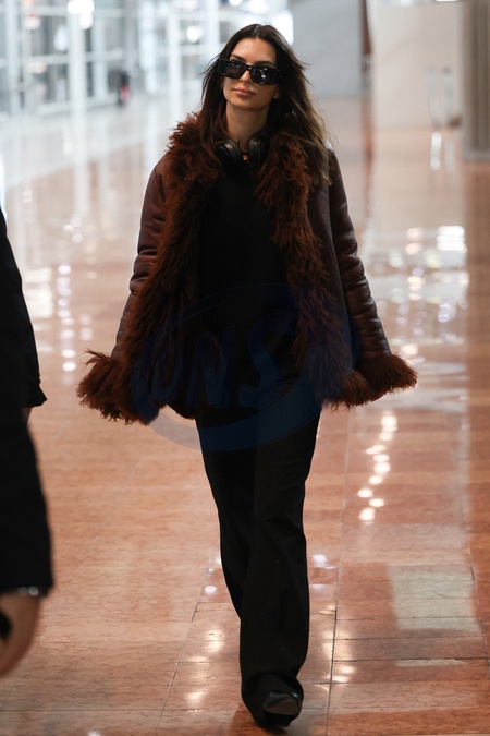 Exclusif - Emily Ratajkowski arrive à l'aéroport de Paris-Charles de Gaulle (CDG) lors de la semaine de la mode femme automne/hiver 2024-2025 (PFW), à Roissy-en-France, France, le 27 février 2024. Exclusive - For Germany Call For Price - Emily Ratajkowski arrives at Paris-Charles de Gaulle Airport (CDG) during Women's Fashion Week Fall/Winter 2024-2025 (PFW), in Roissy-en-France, France, on February 27, 2024.