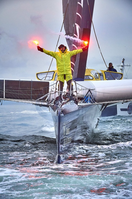 Charles Caudrelier, vainqueur de l'Arkéa Ultim Challenge (50 jours, 19 heures, 7 minutes et 42 secondes) à Brest