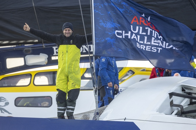 Charles Caudrelier (Maxi Edmond de Rothschild), vainqueur de l'Arkéa Ultim Challenge (50 jours, 19 heures, 7 minutes et 42 secondes) à Brest